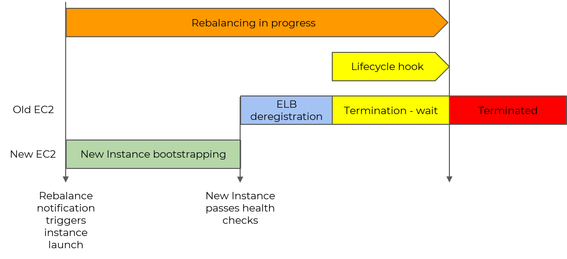 Let’s get into more detail about it since it added more stability to the spots. First, you get a message notifying you of the Capacity Rebalancing signal. The Auto Scaling Group (or a third-party script from which you have received this signal) then starts a new instance running through all of its processes. After that, the instance that has an elevated risk of interruption and that received the Capacity Rebalancing signal will begin to terminate.